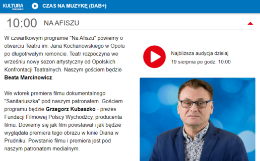 • 19 sierpnia – u Mariusza Majerana w czwartkowym programie porannym Na afiszu opowiadał, jak powstawał film “Sanitariuszka” i dlaczego pokaz przedpremierowy będzie w Prudniku;