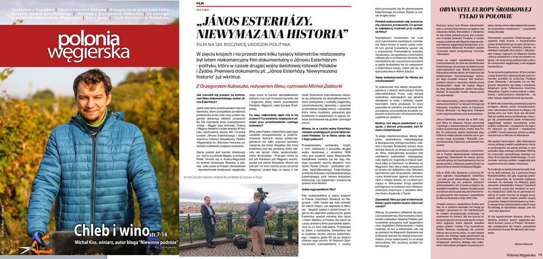 Na łamach październikowego numeru Polonii Węgierskiej ukazał się artykuł o naszym filmie Janos Esterhazy. Niewymazana historia – wywiad z reżyserem i producentem filmu Grzegorzem Kubaszko, który przeprowadził Michał Zabłocki – Prosto z Europy Środka, autor artykułu przybliżającego sylwetkę Janosa (str. 19).